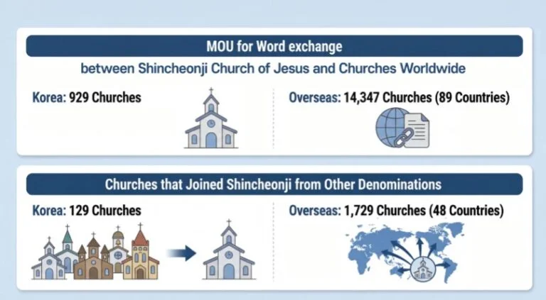 Now in its middle years of faith, Shincheonji Church of Jesus is expanding its engagement with the wider world. The church has been actively building relationships through Word exchange MOUs and sign change MOAs with pastoral communities at home and abroad. As of last year, cumulative Word exchange MOUs have reached 969 churches in South Korea and 14,347 churches across 89 countries overseas. Through sign change MOAs, 129 churches in South Korea and 1,729 churches across 48 countries have changed their church signs to Shincheonji Church of Jesus.
